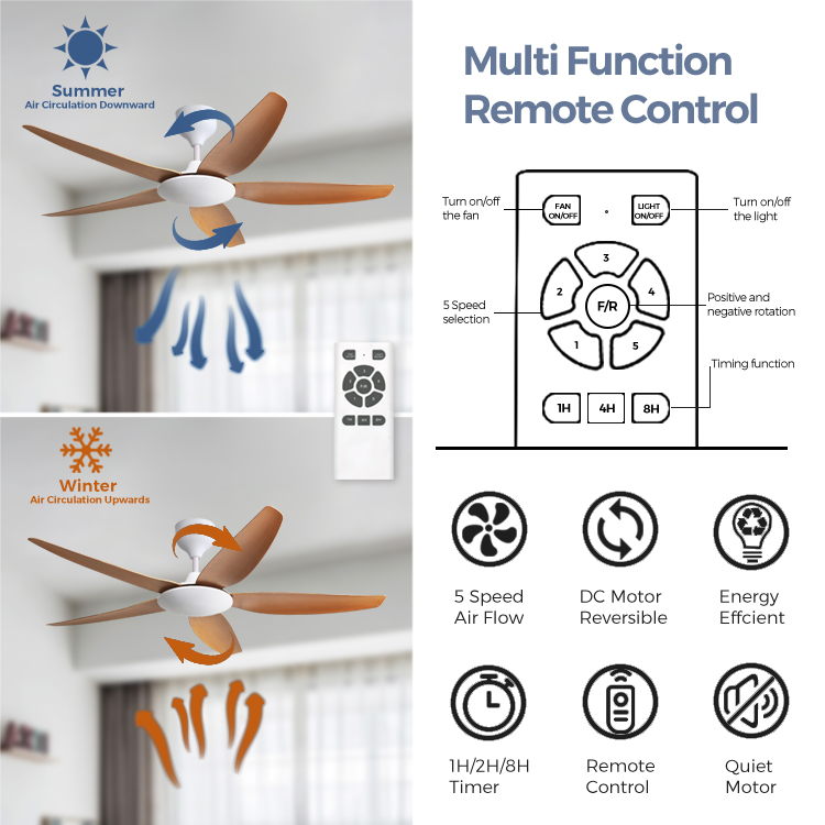 3.MULTI-FUNCTIONS: You can easily control all functions through the smart remote. Functions: 6 fan speed levels, 1/4/8H time setting, 3 color temperatures, reversible mode. The ceiling fan can also allow you to turn on/ off the lights using the wall switch