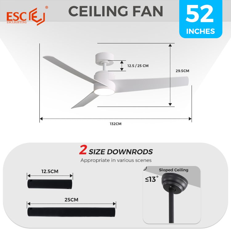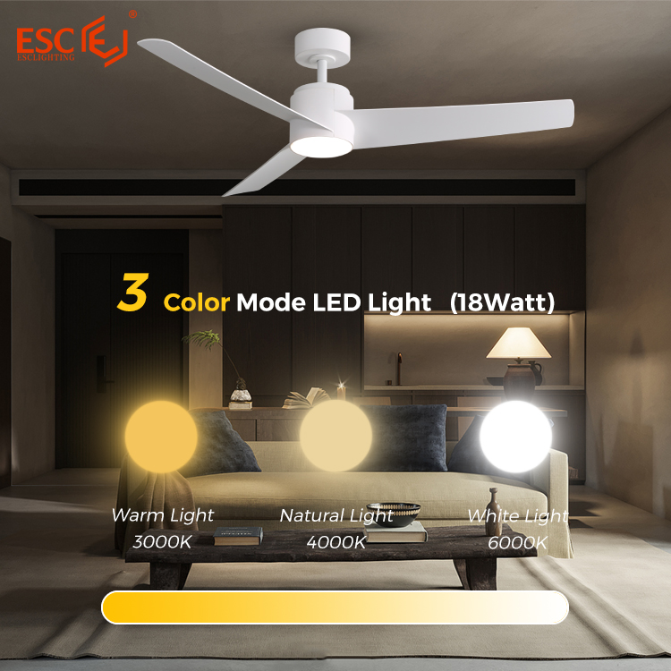 2.52 inches ceiling fan with light: Our 52-inch ceiling fan features adjustable lighting design with a 18W LED light panel. It offers brightness adjustment from 10% to 100% and comes with 3 light colors (3000K warm light, 4500K natural light, 6500K cool light) to meet various indoor settings such as study rooms, bedrooms, and night time lighting needs.