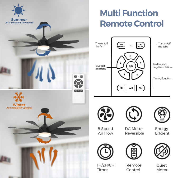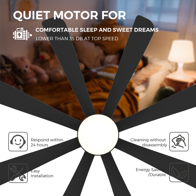2.Quiet DC motor:The brushless DC motor used in the 60 inch ceiling fan is more energy-efficient and durable than traditional large ceiling fan.To get a comfortable feeling. Our quiet operation below 35DB whether reading,sleeping will not be affected