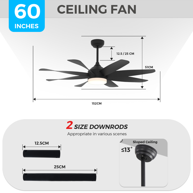 3.Suitable for a variety of locations:Our indoor home decoration ceiling fans have three sizes downrods (6 “12” 24 “) that can be mounted on 12°pitched ceilings to suit the installation needs of different areas.In addition,it comes with detailed operating instructions,easy to install,and you can install this big ceiling fan alone