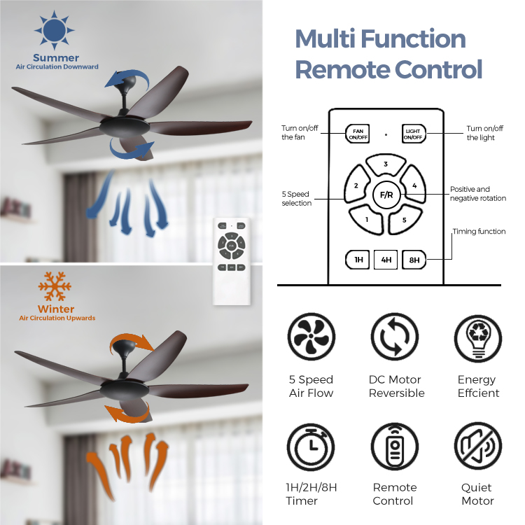 3.MULTI-FUNCTIONS: You can easily control all functions through the smart remote. Functions: 6 fan speed levels, 1/4/8H time setting, 3 color temperatures, reversible mode. The ceiling fan can also allow you to turn on/ off the lights using the wall switch