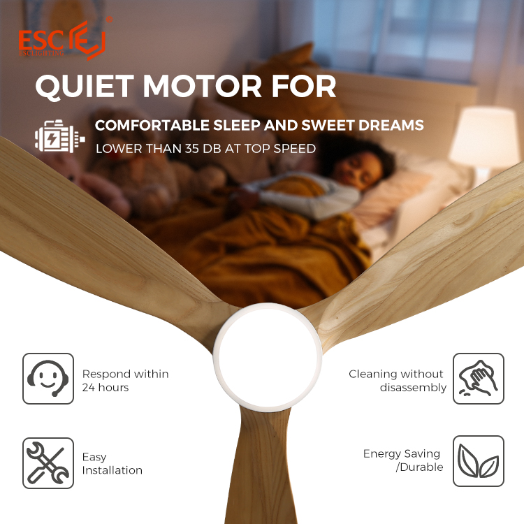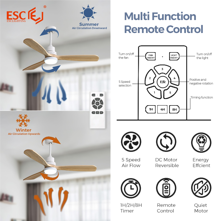 2.【Reversible DC Motor】ETL certification done. this wooden ceiling fan features a DC motor that provides excellent airflow and is 75% more efficient than traditional AC motors. During summer months, the fan moves air downwards at high speed to cool the room. In winter, it can be set to run in reverse, allowing air to flow upwards and circulate warm air throughout the room for even distribution.