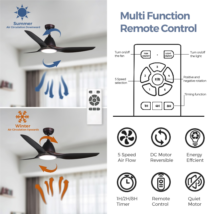 2.Quiet Reversible DC Motor:This ceiling fan features a quiet reversible DC motor;In the summer, it rotates in the forward direction, creating a cool airflow that helps lower the temperature in the room;In the winter, it switches to reverse mode, distributing warm air from the ceiling evenly throughout the room, thus reducing energy costs